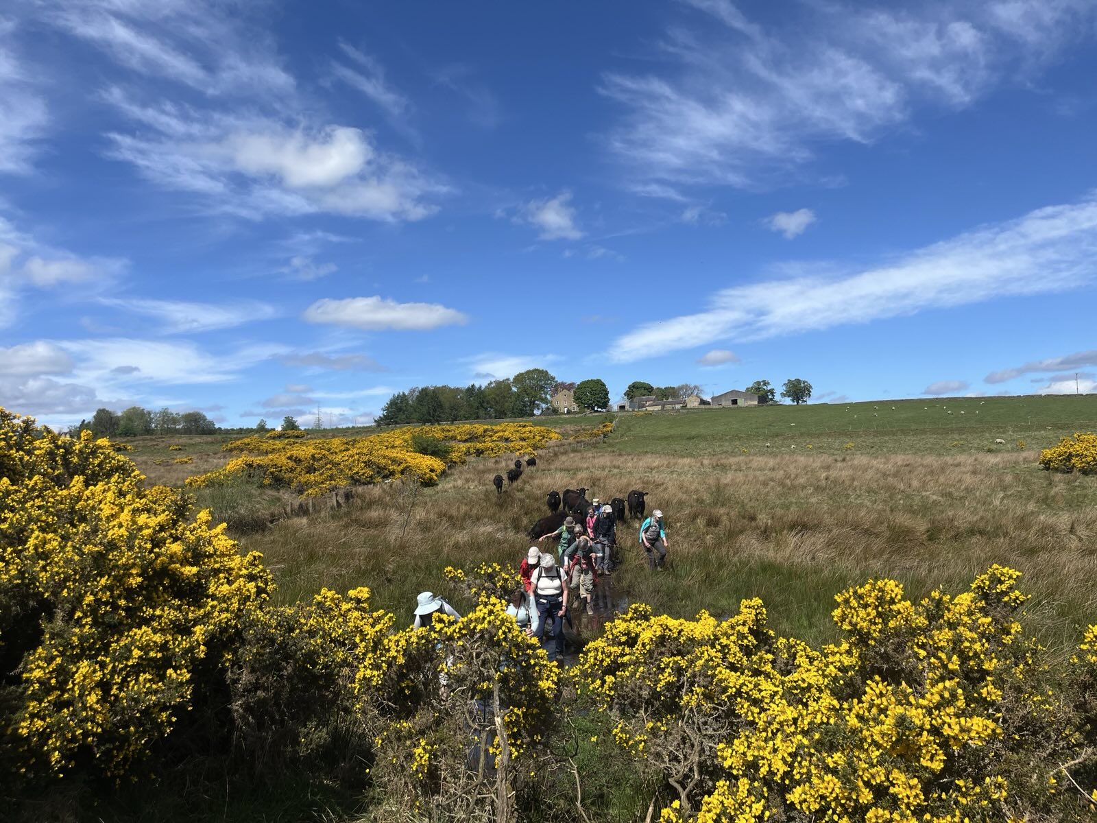 We beleven avonturen die ‘s avonds, bij het terugkijken op de dag, worden herbeleefd. We spotten een bekende acteur tijdens opnames van een detective, de bevalling van een kalf in de wei. De laatste groep die langsloopt, stelt de ‘voorop lopers’ gerust: het kalf drinkt bij de moeder. Een lammetje dat in een kuil is gevallen, wordt heldhaftig gered, als we in een stadje belanden, wordt de tearoom uitvoerig bezocht, er wordt gezwommen in natuurwater, we waden door een modderpoel, achterna gezeten door jonge stieren. Niet alleen is het beleefd, het is ook vastgelegd met hilarische foto’s en filmpjes.